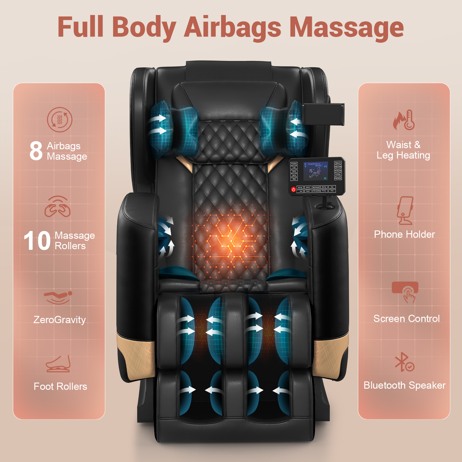 Easy Touchscreen Control & Entertainment Built In】Forget about hunting for the remote—everything is controlled right on the built-in touchscreen. Just tap to switch modes or adjust settings. There’s even a phone holder, so you can watch shows or listen to music while you relax.