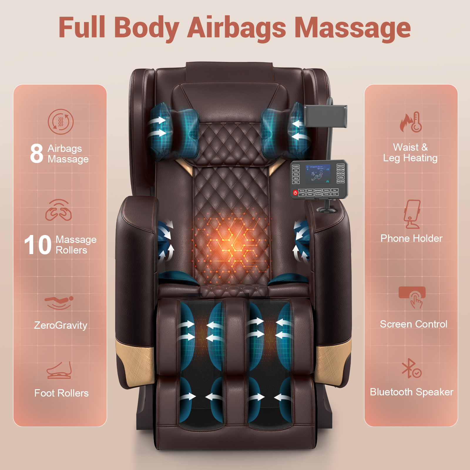 Zero Gravity Massage Chair Full Body with 10 Rollers, Soothing Heat, Deep Foot Kneader & Bluetooth Speakers, Brown