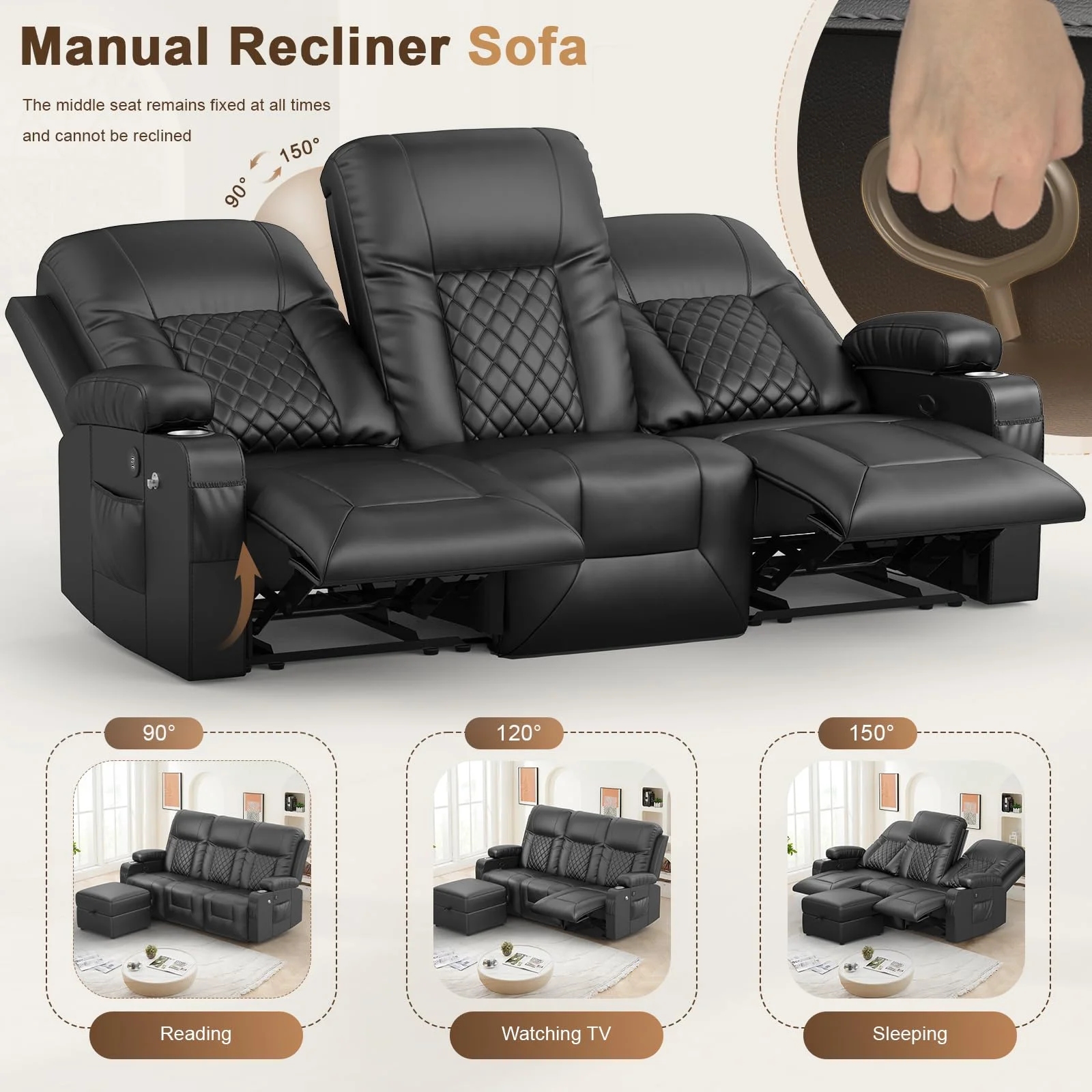 LOBERFVE Recliner Sofa with Storage Ottoman, 3 Seats Recliner, Recliner Couch, Modern Recliner Chair for Living Room, with Cup Holder and 2 Cell Phone Holder, USB Ports