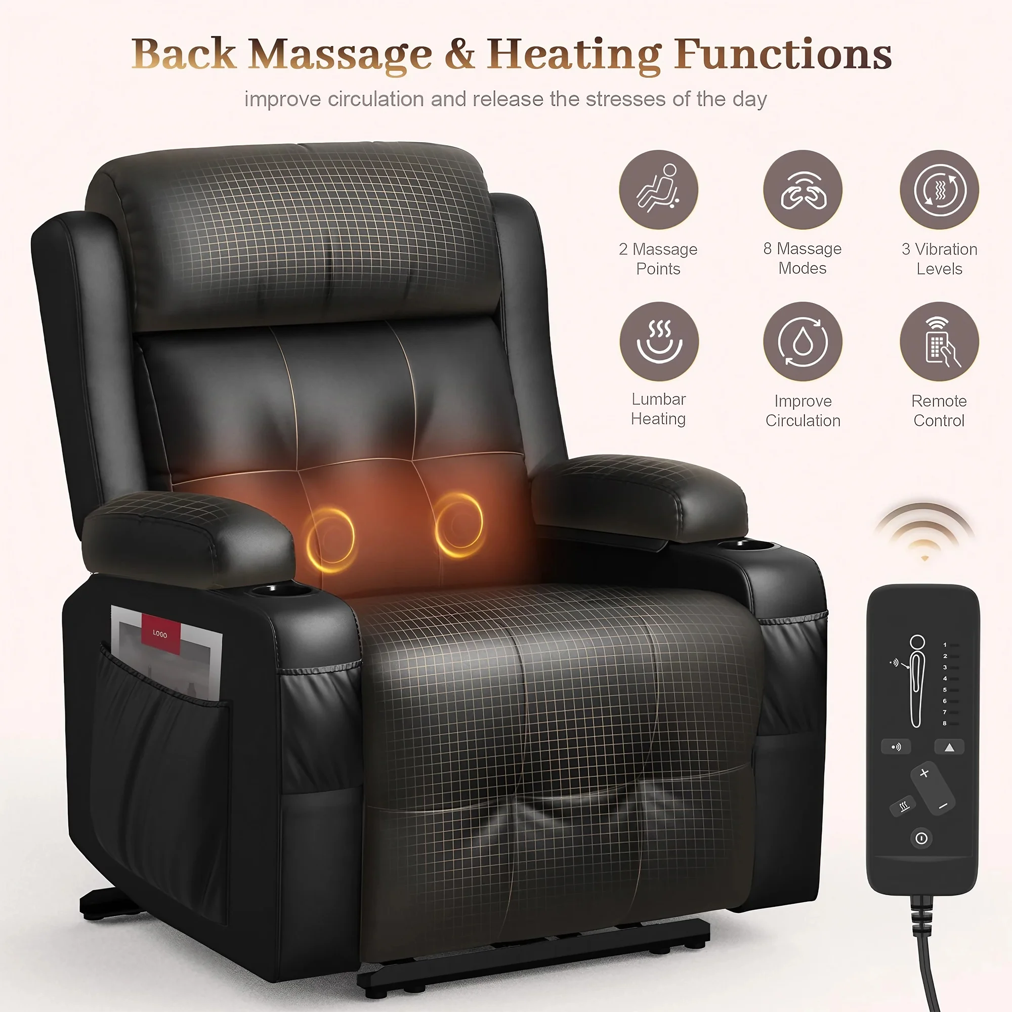 Loberfve Power Recliner, Oversized Recliner with Heat and Back Massage, Leather Recline Chair with Storage Armrests, 2 Cup Holders for Living Room, Bedroom, Black