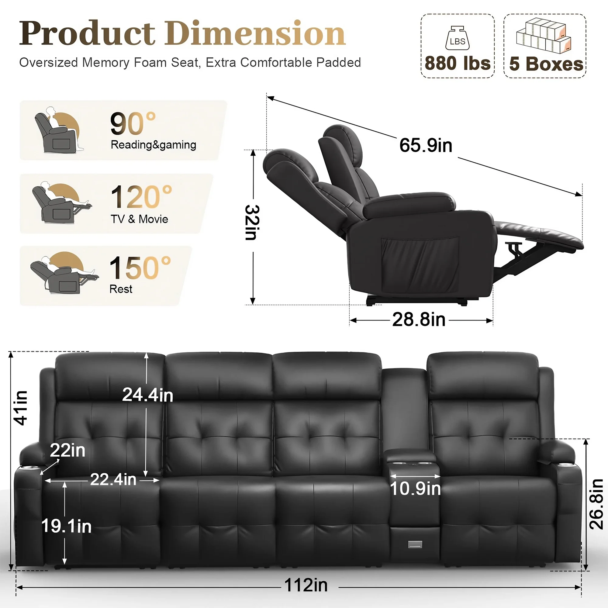 • 【Comfortable Theater Reclining Sofa】- Padded-pillow designed headrest cushioning reclining couch with high-end premium PU leather(easy to clean and maintain), comfortable memory foam, and cloud-like soft cotton, provide luxurious comfort.