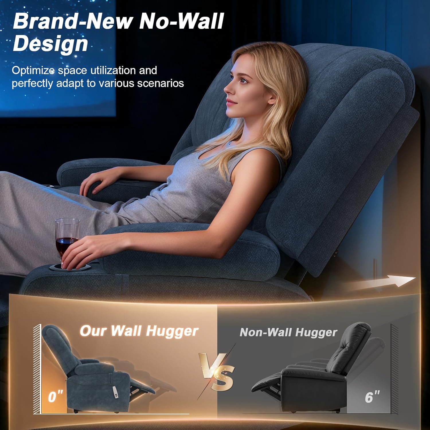Fits Flush, Saves Space】If you're working with a tighter layout, you'll appreciate the zero wall-hugger design—it doesn't need any gap behind it to recline fully, which is a game-changer for RVs, apartments, or smaller media rooms where every inch counts.