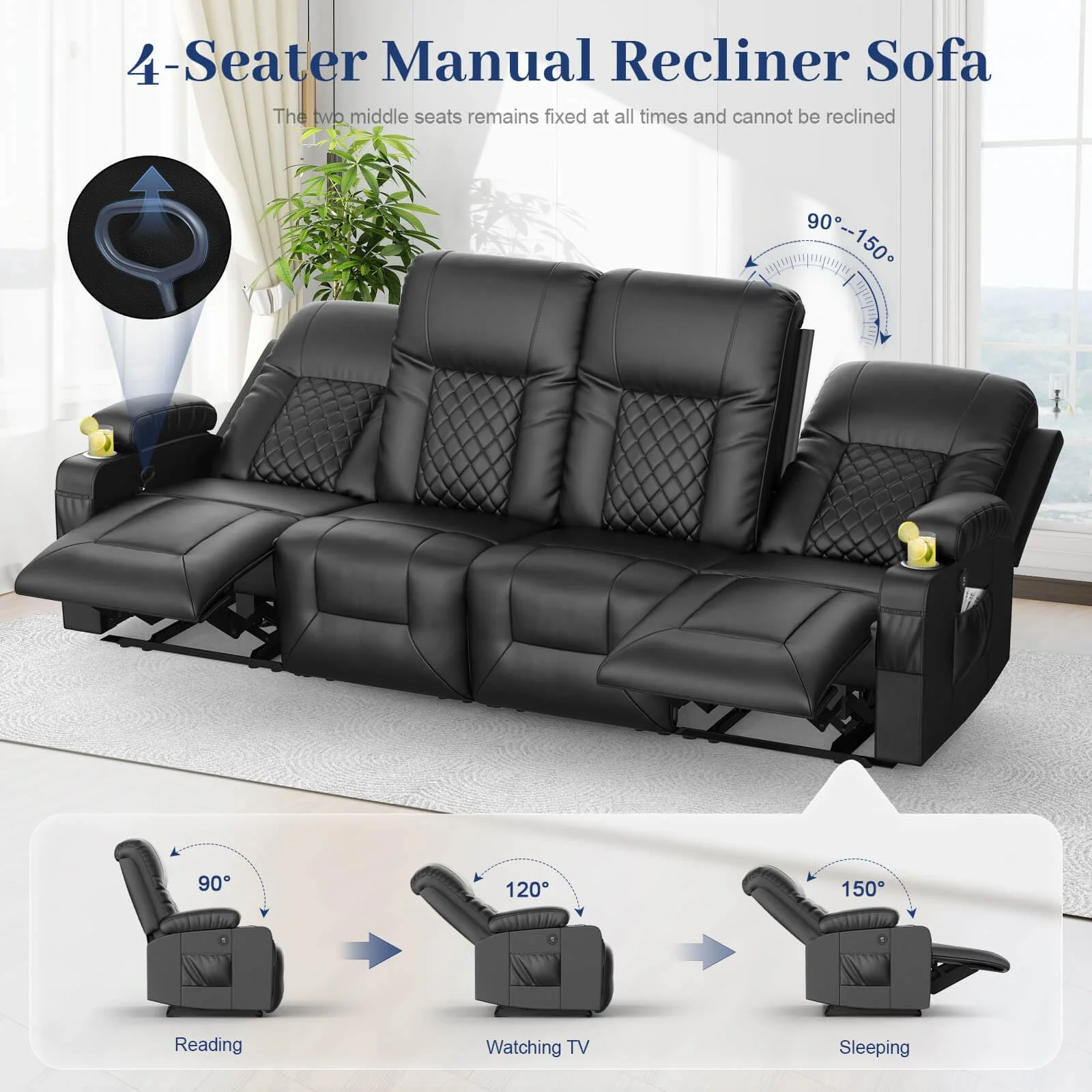 This manually operated recliner sofa combines comfort and practicality with a smooth manual adjustment design: simply pull the rings on both sides of the seat to raise the footrest, recline by leaning back, and step on the footrest to reset. It operates without electricity, ensuring functionality even during power outages, though the middle seat is fixed and cannot recline. The sofa features 8 vibration massage points (covering the back, waist, thighs, and legs) and a lumbar heating function, which provides gentle warmth within 10 minutes to relax muscles. It supports 360-degree rotation and adjustable reclining angles from 120 to 150 degrees, making it suitable for reading, watching movies, or resting. With a simple and modern design in classic colors, it blends into various decor styles such as bedrooms, living rooms, or studies. The ergonomic curvature, high-density foam, and extended footrest offer targeted support, reduce fatigue, and promote blood circulation for an enhanced relaxation experience.